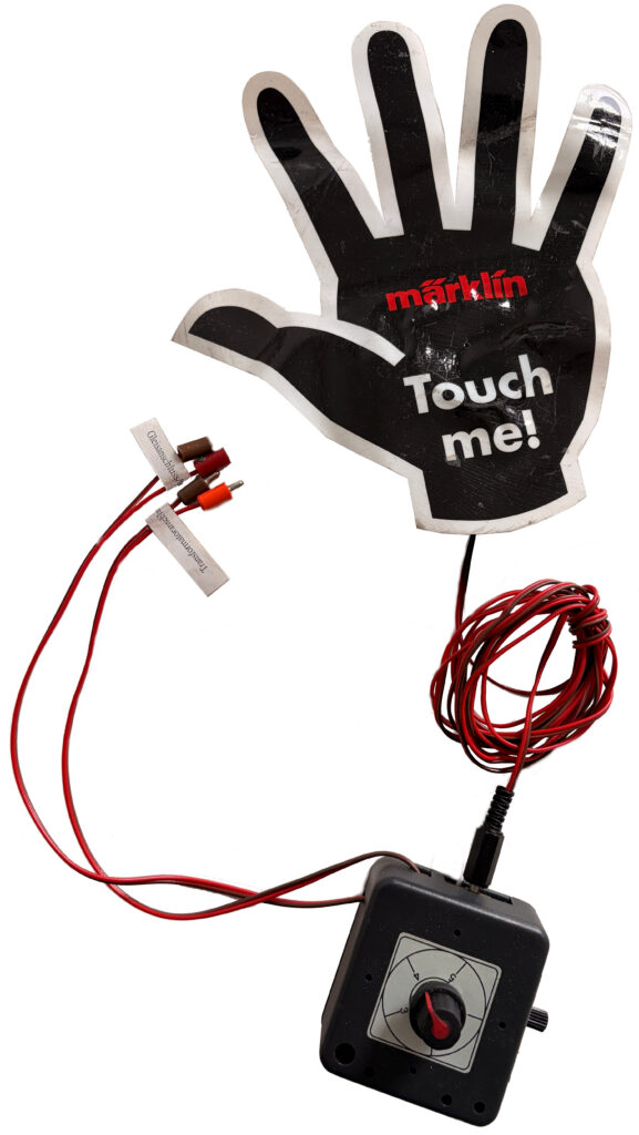 Die beiden hier gezeigten Varianten dieses Gerätes unterscheiden sich lediglich durch das aufgedruckte Motiv, es ist durchaus möglich das noch weitere Motive im Umlauf waren. Der Besucher hält einfach seine Hand an das Schaufenster und über zwei Helligkeitssensoren wird der Transformator für die Anlage eingeschaltet. Beide Motive sind aus Plastikfolie gedruckt und konnten selbstklebend von innen am Schaufenster – welches hoffentlich gut geputzt war – angebracht werden.